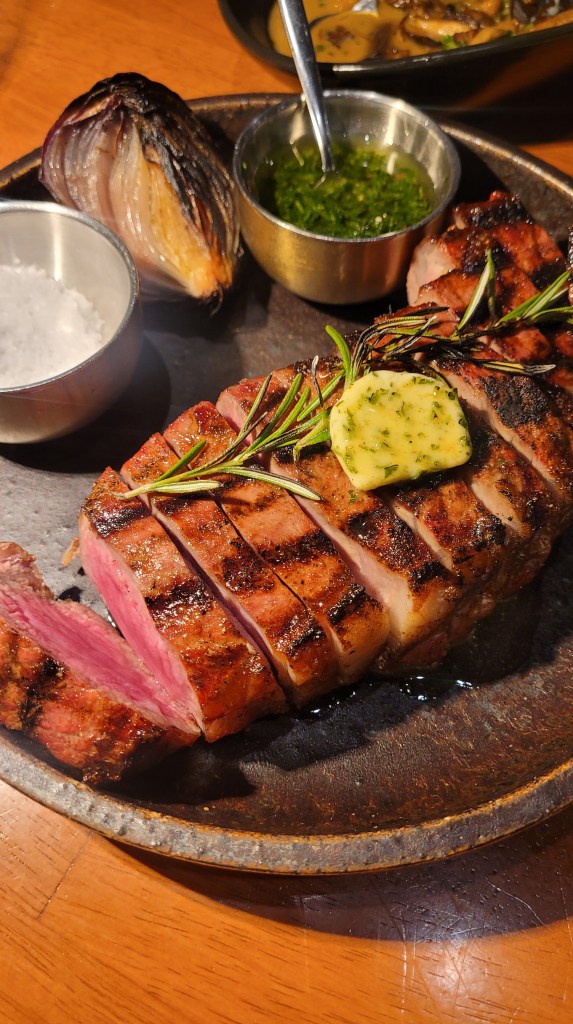 Then came the main event: a juicy, 16 oz prime New York strip steak, grilled just right, served with a delightful chimichurri sauce that had the nerve to be both bold and balanced. Every bite was seasoned just right, tender, and full of “this is what I came for” energy. Because after all, we were at a steakhouse.