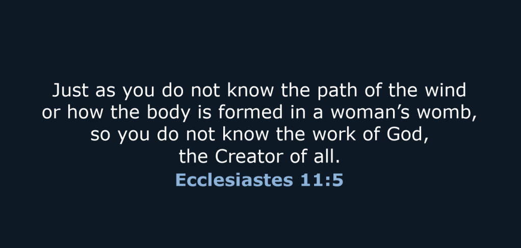 But Ecclesiastes 11:5 stops me in my tracks. It reminds me that I cannot possibly know the work of God. How He weaves every decision, detour, and delay into something meaningful. There’s no alternate version of my life where I can see what He would have allowed or withheld, because every scenario would still be filtered through His sovereign hand.