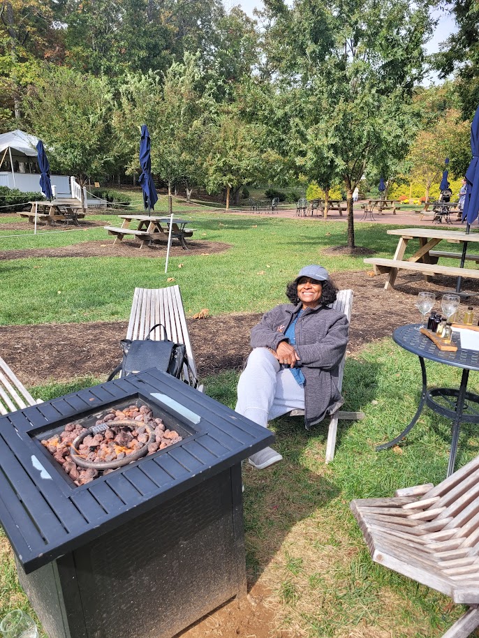 Our first stop this time led us to Veritas Winery, which is in Afton, VA, about 20 minutes west of Charlottesville. Out of the four wineries I’ve been to in this area, I would rate this one #1 as far as total experience. Not only were the wines delicious, but the scenic views were breathtaking, and the friendliness of the staff and the overall warmth of the surroundings made Veritas feel like home. In addition to the inside fireplace, we also loved the fire pit stations looking out to the lawn and vineyard, which is where mom and I decided to set up shop for the day. And what a gorgeous fall day it was!